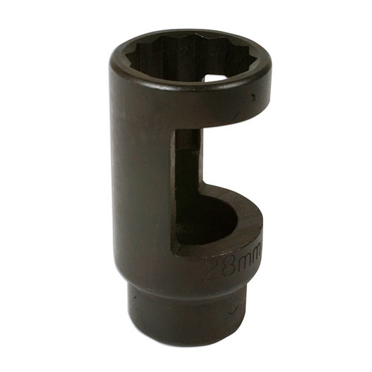 Diesel injector socket for the assembling and dismantling of injectors on HGV’s. ? Applications: Scania and Volvo HGV. ? Bi-Hex (12pt) x 28mm. ? With access window, allowing the socket to easily fit over the injector. ? Manufactured from Chrome Vanadium.