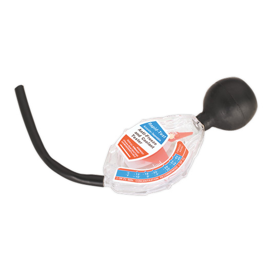 Tests ethylene glycol strength and includes temperature adjustment scale for accurate interpretation of mixture strength. Composite body and rubber bulb for workshop durability.