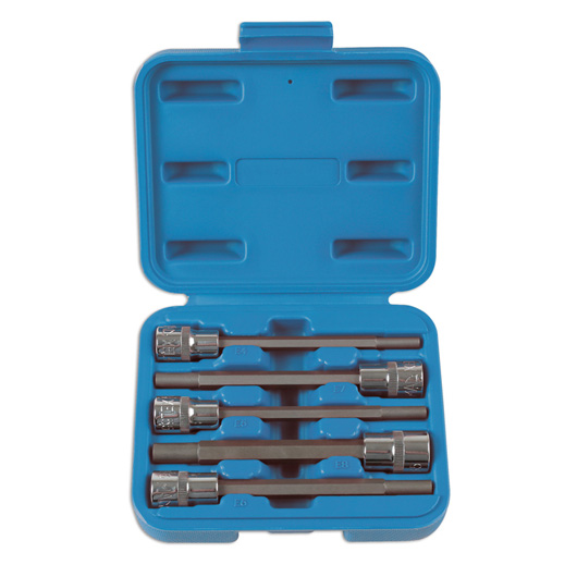 A set of Long Series (127mm) Star* profile sockets, ideal for use in tight or hard to reach areas. ? Socket sizes: E4, E5, E6, E7, E8. ? Star* profile x 127mm overall length; 95mm shaft length 95mm. ? Manufactured from satin finish chrome vanadium, with impact grade S2 steel shafts.