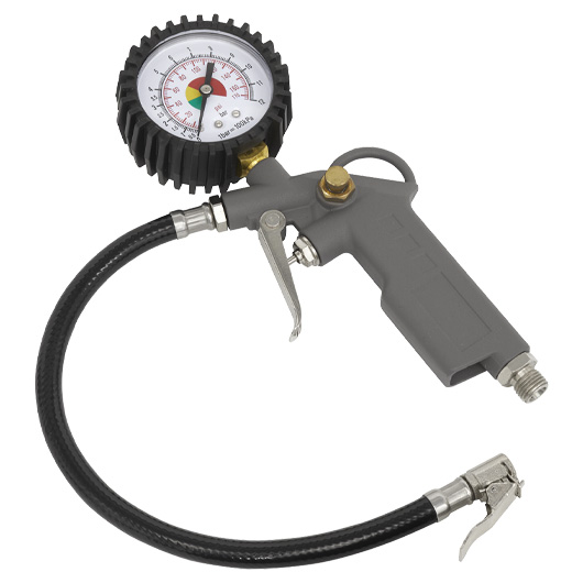 • DURABLE – Die-cast body and dial type gauge with rubber protector. • MULTIFUNCTION – Able to inflate and deflate tyres. • CONNECTION – Fitted with single clip-on connector. • BRASS BLEED BUTTON – Useful when deflating an over pumped tyre. • RANGE – 0–12bar (0–175psi).